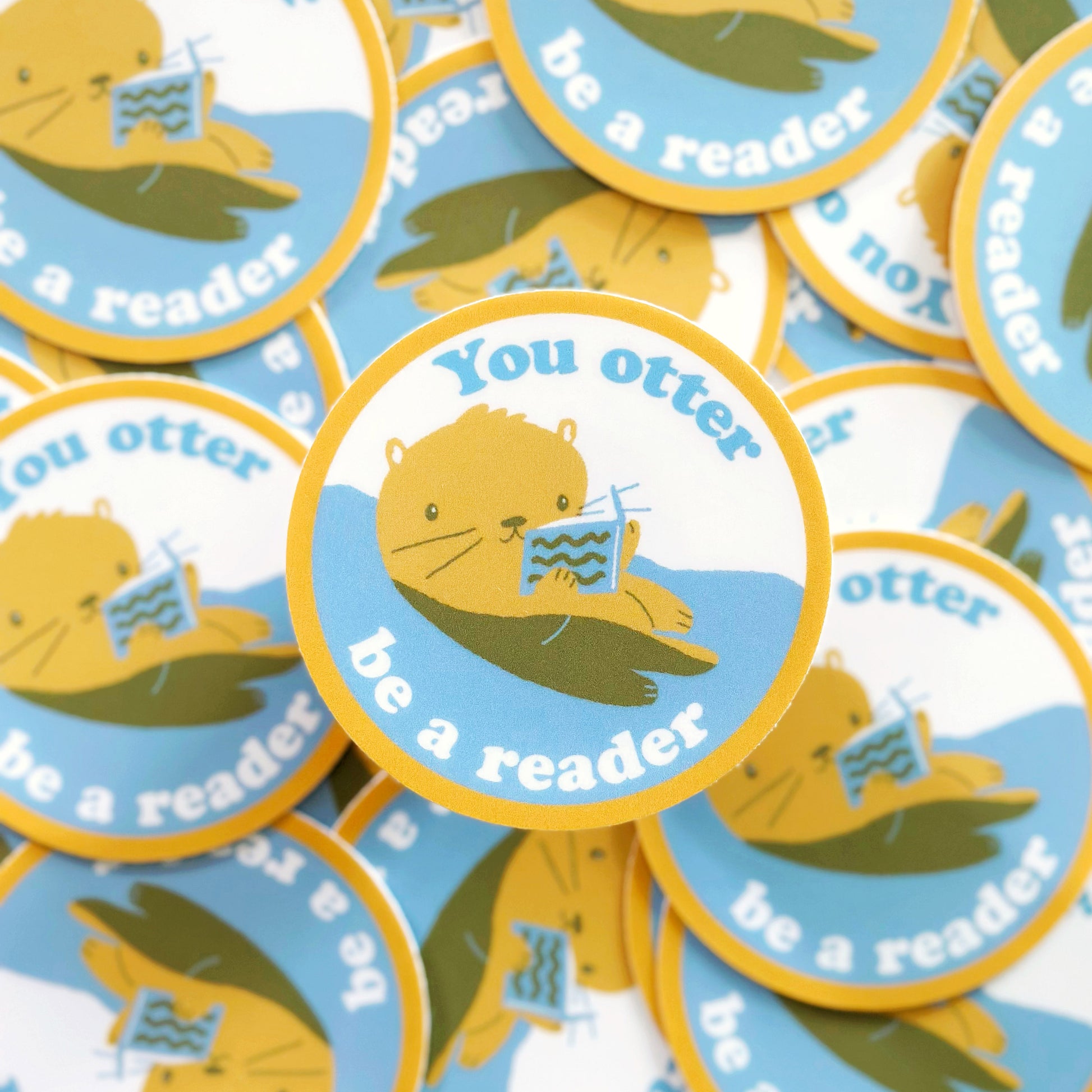 This 3 inch glossy vinyl sticker features 2017 Cute K.O. competitor Floaty Otter and the text “You Otter Be A Reader.” Perfect for fans of otters and/or reading! These buoyant bibliophile stickers are coated with a UV resistant laminate and are durable for 5+ years outdoors. These stickers are also waterproof, sun proof, tear proof, dishwasher safe, and microwave safe.